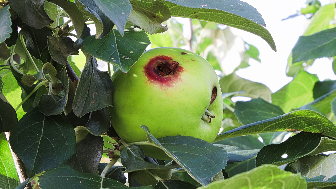 Nach dem Schlüpfen fressen sich die Larven ins Fruchtinnere und hinterlassen Bohrlöcher, braune Fraßgänge und Kotkrümel. Oft wird der Befall erst spät erkannt – wenn die Frucht bereits beschädigt ist oder vorzeitig abfällt.